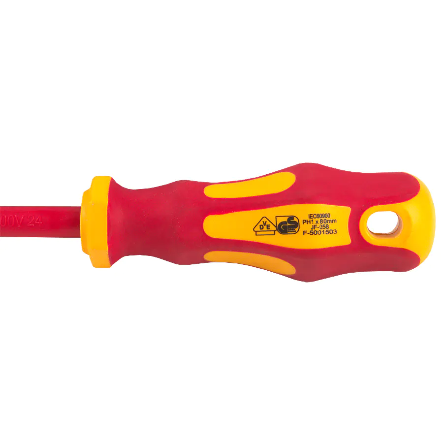 Диэлектрическая отвертка PH1x80 мм — профессиональный инструмент для безопасного электромонтажа. Изоляция стержня и рукоятки гарантирует защиту при работе под напряжением до 1000 В.