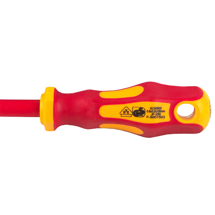 Диэлектрическая отвертка SL3,5x100 мм — профессиональный инструмент для безопасного электромонтажа. Изоляция стержня и рукоятки гарантирует защиту при работе под напряжением до 1000 В.