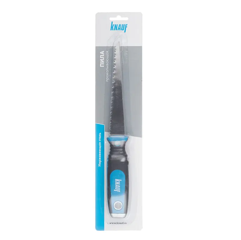 Пила KNAUF Штихзаге применяется для резки фигурных отверстий в гипсокартоне, пенобетоне, древесине, и пр. Режущее металлическое полотно из нержавеющей стали с пластиковой рукоятью. Длина лезвия 150 мм. Общая длина пилы 280 мм.