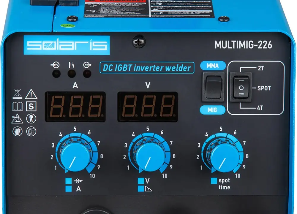 Полуавтомат сварочный Solaris MULTIMIG-226, позволяющий варить в режиме полуавтоматической MIG/MAG/FLUX и в режиме ручной дуговой (ММА) сварки. Аппарат оснащен евроразъемом для горелки, возможностью смены полярности для сварки проволокой без газа (FLUX). Аппарат построен с использованием IGBT-транзисторов, обладает набором функций HOT START, ANTISTICK; имеет защиту от перегрева, перегрузки.