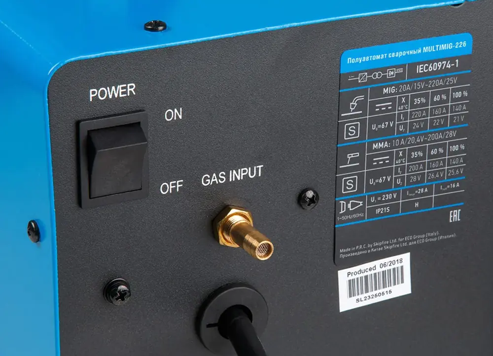 - Номинальный выход (MIG): 20-220 A.