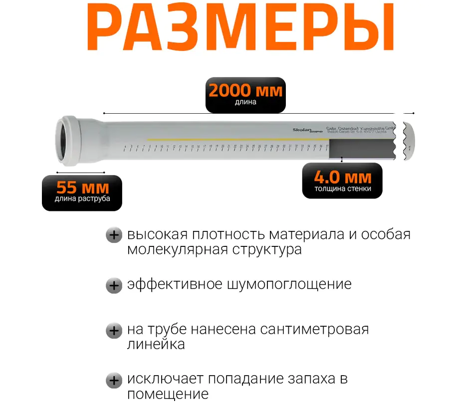 Труба бесшумной канализации Ostendorf Skolan 58х2000 мм предназначена для отведения сточных вод внутри зданий и обеспечения комфорта по шумоизоляции. Она оснащена раструбным соединением и немецким уплотнительным кольцом, что обеспечивает простоту и надежность монтажа. Для присоединения труб, сифонов и прочих фасонных частей диаметром 50 мм, потребуется переход 58х50 мм.