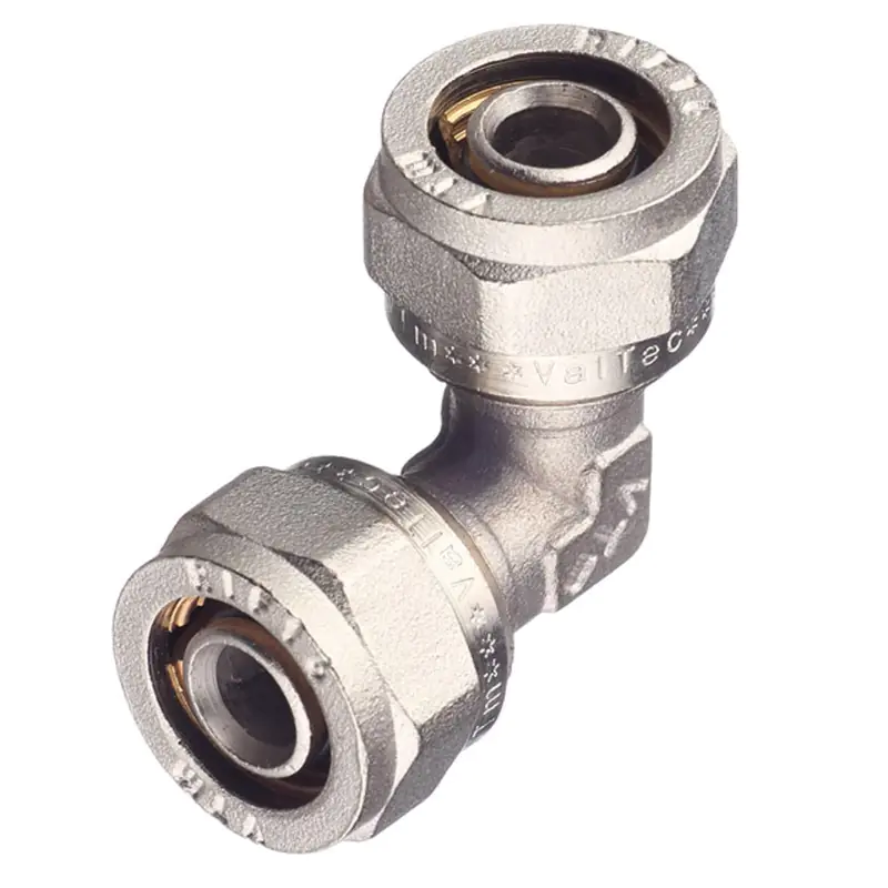 Угольник обжимной Valtec предназначен для соединения двух металлополимерных (металлопластиковых) труб равного диаметра под углом 90° друг к другу. Диаметр труб 16 мм. Может использоваться в системах питьевого и хозяйственного водопровода, горячего водоснабжения, отопления, а также на технологических трубопроводах, транспортирующих жидкости, не агрессивные к материалам фитинга.